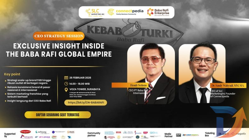 DigitalJatim.com – Connectpedia Family Business Community bersama SLC Marketing Inc bakal menggelar CEO Strategy Session di Voza Tower, Surabaya, Kamis (26/2/2026). Forum ini mengusung tema Exclusive Insight Inside The Baba Rafi Global Empire.