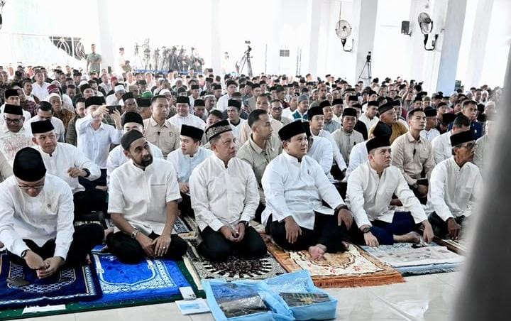 Aceh Tamiang – Presiden Republik Indonesia Prabowo Subianto melaksanakan salat Idul Fitri 1447 Hijriah di Masjid Darussalam, kompleks hunian sementara (huntara), Kabupaten Aceh Tamiang, Sabtu (21/3/2026).