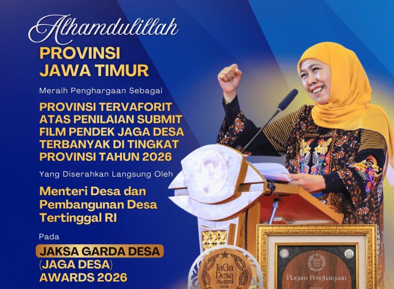 Jakarta – Pemerintah Provinsi Jawa Timur kembali menorehkan prestasi nasional dengan meraih penghargaan sebagai Provinsi Terfavorit atas Penilaian Submit Film Pendek Jaga Desa Terbanyak Tingkat Provinsi dalam ajang Jaga Desa Award Abpednas 2026.