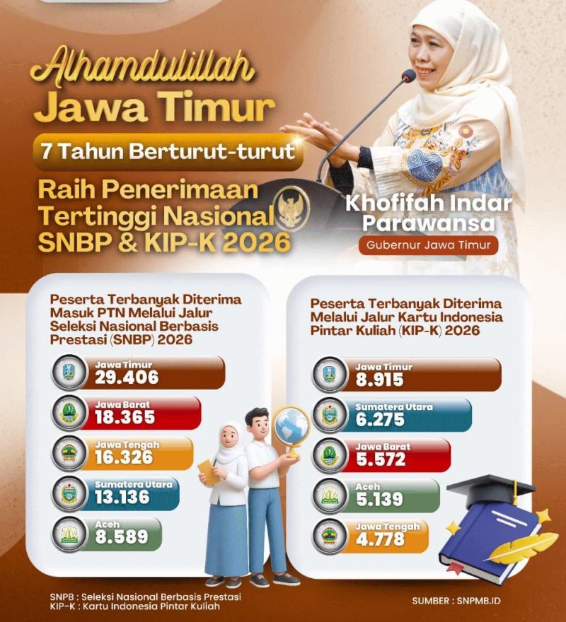 Surabaya – Jawa Timur kembali mencatatkan prestasi membanggakan di bidang pendidikan. Sebanyak 29.406 murid asal Jawa Timur dinyatakan lolos ke Perguruan Tinggi Negeri (PTN) melalui Seleksi Nasional Berdasarkan Prestasi (SNBP) tahun 2026.