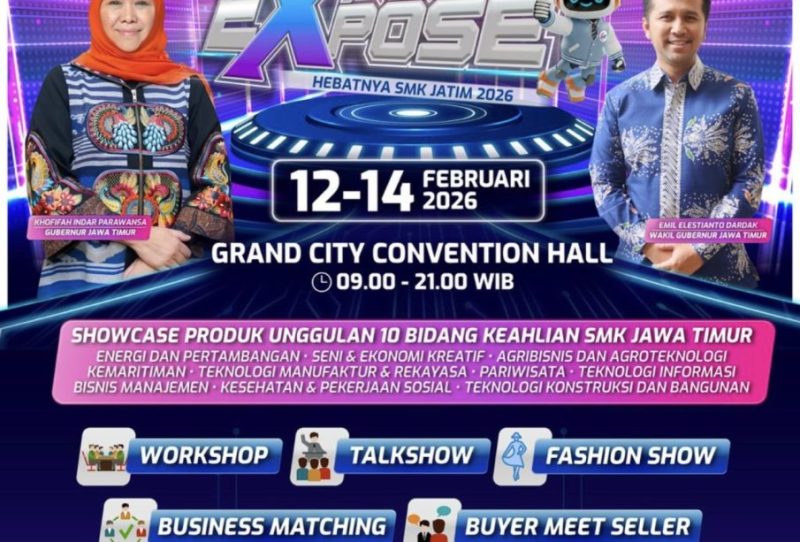 DigitalJatim.com – Dinas Pendidikan (Dindik) Jawa Timur menggelar Pameran Expo Expose SMK di Hall Expo Grand City Mall Surabaya. Acara ini berlangsung selama tiga hari, 12–14 Februari 2026.